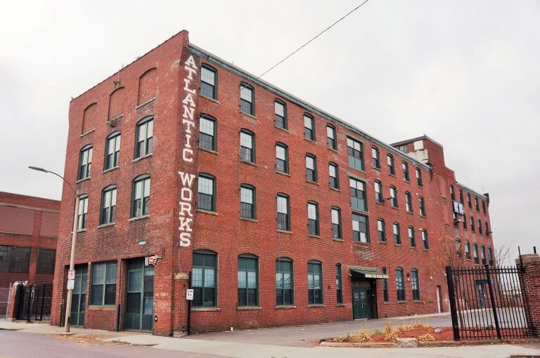 Artists’ work spaces occupy the upper floors and a sculpture garden and art gallery are located on the first floor. The building includes the Atlantic Works Cultural Center.