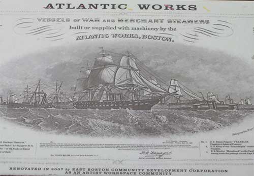 Atlantic Works, which produced steamship boilers and engines, was established in 1853 and was originally located at Chelsea and Marion streets. In 1893 Atlantic Works constructed the three-story building that still stands. The building features a large arched doorway that faces the doorway and a smaller arched doorway on New Street.